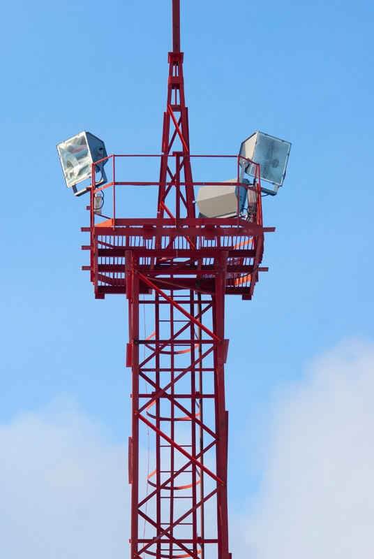 Верхняя часть прожекторной мачты состоит из специальной площадки для смотровых и ремонтных робот, а далее – из нескольких рядов светильников/осветительных установок. Остальная часть представляет собой закрепленный металлический стержень с системой молниеотвода. Вас также могут заинтересовать прожекторные мачты ПМС-29,3.
