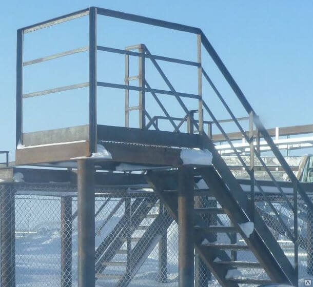Стальные сварные ограждения соответствуют требованиям ГОСТ 23120 и Р 53254. В техпроцессе изготовления элементов ограждения - стойках и поручнях используются уголки из горячекатанной стали (ГОСТ 8509). Заготовками для производства данных металлических изделий из таких марок сталей как ст3пс или ее аналогов является сертифицированный горячекатаный металлопрокат. Поскольку углеродистая сталь имеет низкое сопротивление коррозии, то на элементы ограждений наносятся дополнительные слои для защиты от влаги. Такой защитой может стать грунтовка гф-021, как вариант, для металлоизделий, которые будут использоваться в жестких условиях эксплуатации, дополнительно носят слой эмали пф-115.Лестничные ограждения представлены в нескольких конфигурациях - для пожарных и технических лестниц с углом наклона 60 и 45 градусов и высотой пролета от 1,2 до 4,2 м, высота металлических ограждений может составлять 1000 или 1200 мм.